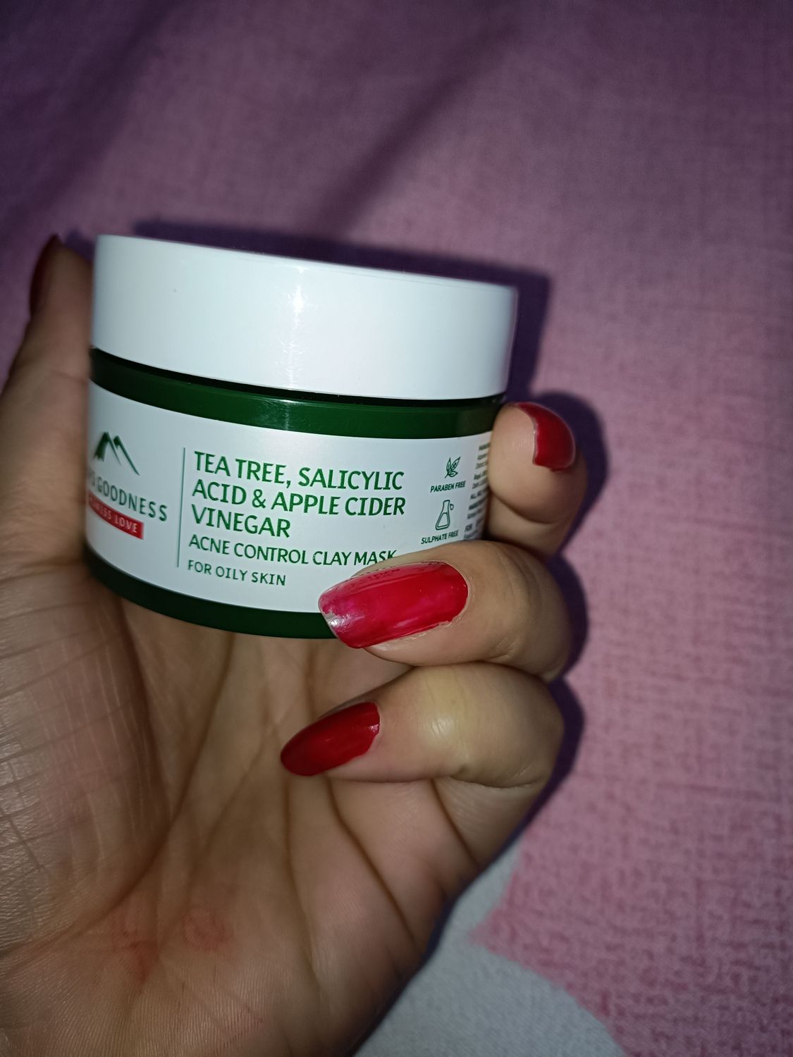 After using 4 months I write this review.This face mask really good for oily acne prone skin 👍.This face mask mean ingredients is salicylic acid.which really good for oily Skin ❤️ Highly recommended 👍 Thank you purple 💜 also thank Alps goodness ❤️