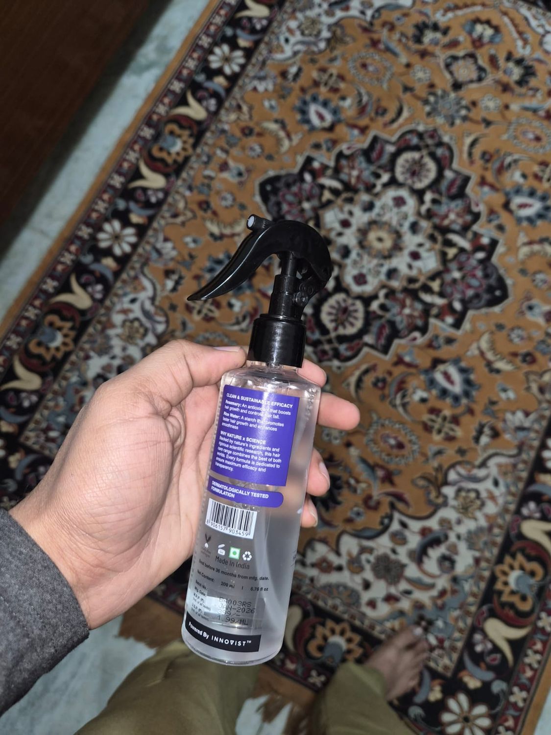 Rosemary and rice water are good for hair, this product gives both. It feels natural, without unnecessary smell, with non-greasy and fast absorbing feature. Spray quality is also good, one can use light spray and heavy spray which can be triggered by a simple click. A value for money product.