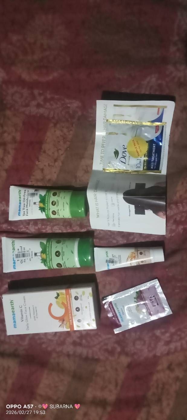 I ordered Mamaearth Tea tree oil face wash and mamaearth Tea tree oil Moisturizer . But I got 6th product . I got four gifts like mamaearth vitamin c daily glow face cream (80gm) , mama rice face dewy bright face wash( 20gm) mamma onion shampoo (8.5gm) dove hair marks (14ml) I am very surprise and so happy.🤗🤗🤗🤗 Thank you Purple 💜💜💜💜