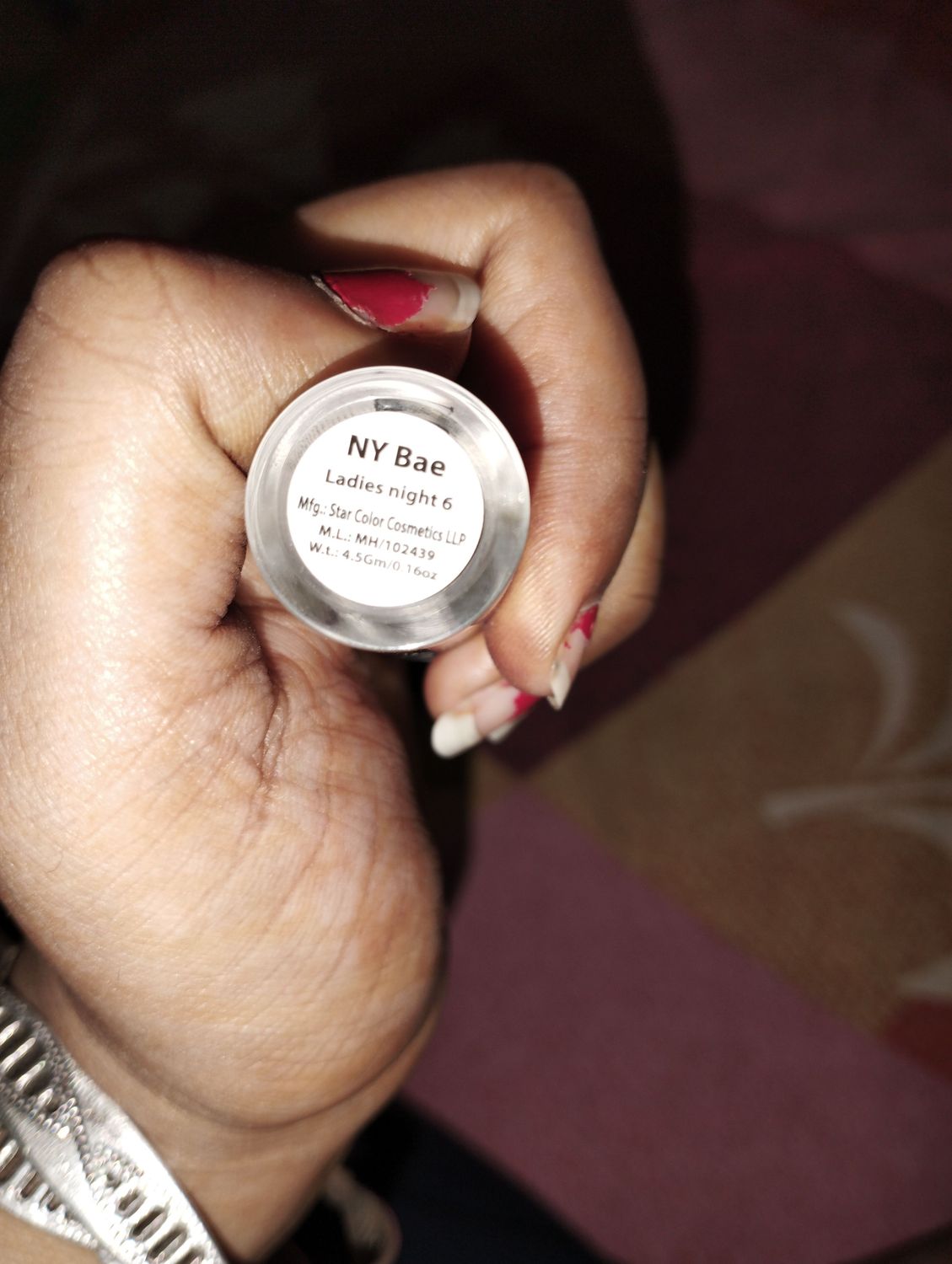 my 1st lipshade from ny bae ( ladies night) this shade is pinkish purple on my skintone ( MAC NC25).affordable/goodfinish/smudgeproof/waterproof/comes out a bit if soap is used/smooth matte finish. 2nd time buying it.