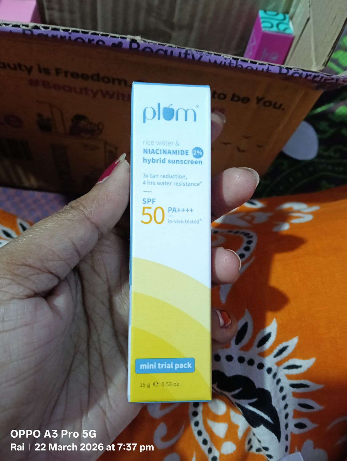 I thought only fixderma spf suncream suits me but i get this plum rice sunscreen as freebe.. After one use i noticed its light weight and my skin turned glowing now. This indicates me now its time to switch sunscreen from fix derma to plum❣️